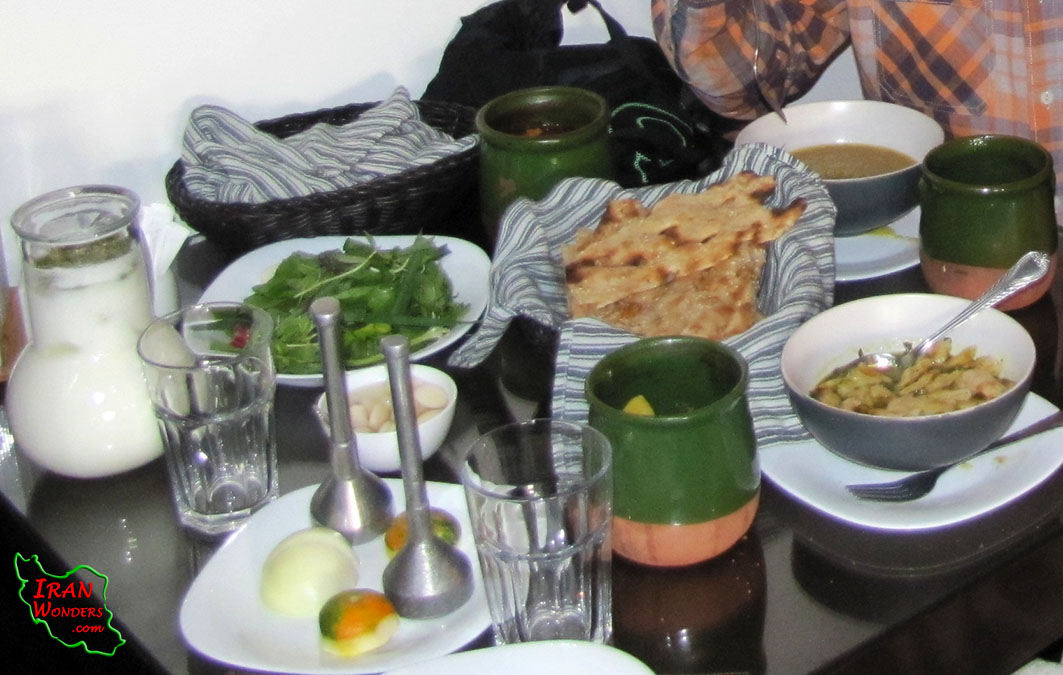 در رستورانهای سنتی هم غذاهایی همچون آبگوشت، کشک و بادمجان، حلیم بادمجان، کاله جوش، کوفته، کتلت، کوکو، میرزا قاسمی، دلمه برگ، دلمه بادنجان و انواع خوراک قابل تهیه هستند که به همراه نان تازه سرو می شوند. عموما از چهار نوع نان در ایران استفاده می شود. نان سنگک که به شکل بزرگ و نسبتا ضخیم بر روی سنگ های کوچک در تنور افقی پخته می شود و در هنگام خوردن باید مراقب بود که سنگ چسبیده به پشت نان زیر دندان نرود، بربری که ضخیم و کوچکتر است و در تنورهای افقی پخت می شود، تافتون در تنور پخته و برشته می شود و لواش که بسیار نازک است و به سرعت در تنور پخته می شود و تازه آن نرم و لطیف است، لیکن نان های محلی متنوع دیگر هم ممکن است سرو شوند. غذاهای ایرانی عموما از غذاهای آرام پز به شمار می روند و معمولا بصورت کبابی، آبپز، تنوری، سرخ کرده و به ندرت بخارپز تهیه می شوند. برنج هم اغلب به دو صورت آبکش و کته تهیه می شود.