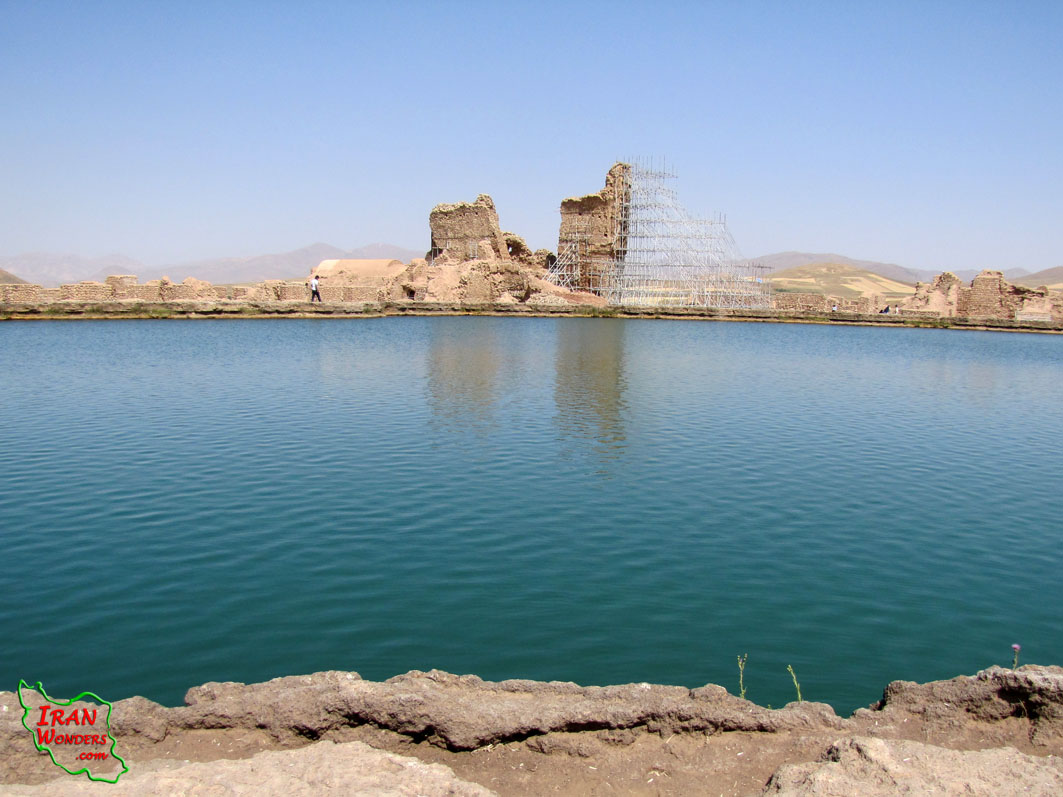 Takhte Soleyman temple is located in Takhte Soleyman village, 42 km away from the north of Takab at E47,14.201 , N36,36.109 , h=2170 m above the sea level. It is one of the unique places that lets us do research on different ancient periods of Iran. The evidence of Middle Pala Eolithic era (100 to 40 thousand years ago) and Neanderthals life and a temple from Mannaee era in the south of the mount Zendan, Achaemenians, Ashkaniyan and Sasaniyan dynasty in different places in the site or around mount Belqeys and Soleyman prison are found. The circular-shaped walls around the fire-temple must be remained from Ashkaniyan dynasty like the wall of Tisfoun. Circular or oval shaped walls have been popular during Ashkaniyan dynasty. 36 crenation of the wall could have been used as a calendar like the one in Stone Henge. Azargoshnasb fire-temple which means stallion (male horse) fire, and is one of the three famous fire-temples of Zoroasterians, is the most important part of Takhte Soleyman, all of them were built by “Pirouz”, the Sasaniyan king and the father of “Anooshirvan”. It is mentioned in some sources that Zoroaster was born in the city of Shiz in Azarbayejan, and has gone to mount Sabalan and in his privacy in the mountain, the holly book of Avesta descended to him.