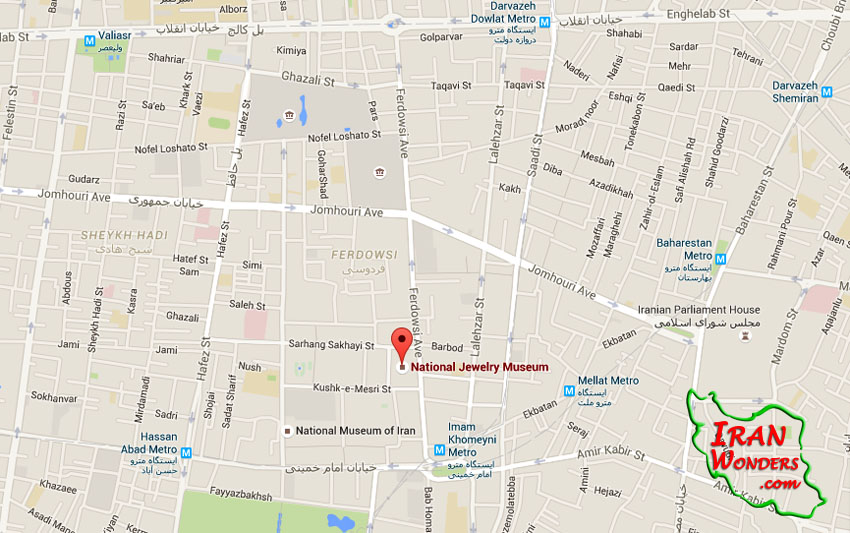 در تهران خیابان فردوسی پایین تر از چهارراه استانبول و مقابل سفارت آلمان خزانه جواهرات ملی قرار دارد. این گنجینه مجموعه ای از گرانبها ترین جواهرات جهان است که طی قرون و اعصار فراهم امده است. این مجموعه بی نظیر بخشی از پشتوانه اسکناس ملی کشور است که توسط بانک مرکزی ایران نگهداری می شود.